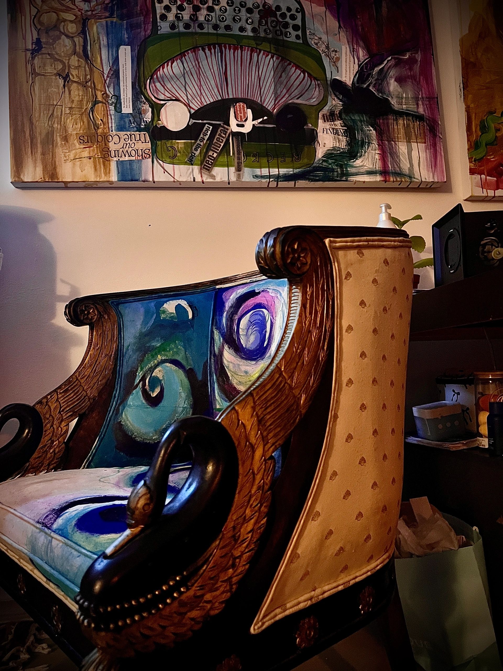 Jacqueline’s visual art is bold and lyrical, using canvases and beadwork to reclaim space from the male gaze. Her pieces assert autonomy and perspective, transforming traditional forms into statements of resistance and self-definition. Each work invites viewers to engage with intimacy, texture, and narrative through a lens of care, presence, and defiance.